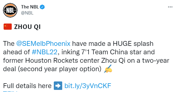 与此同时,周琦感谢东南墨尔本凤凰队的诚意与认可,期待与主教练Simon Mitchell及教练组的合作;也感谢发来邀请的其他几支球队;最后感谢中国篮协,能更好地为中国国家队贡献绵薄之力是我不变的追求和目标。