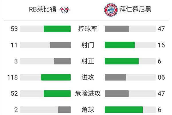 第54分钟,拜仁前场反抢成功,穆西亚拉传中,萨内后点打空门得手,拜仁3-0领先莱比锡。