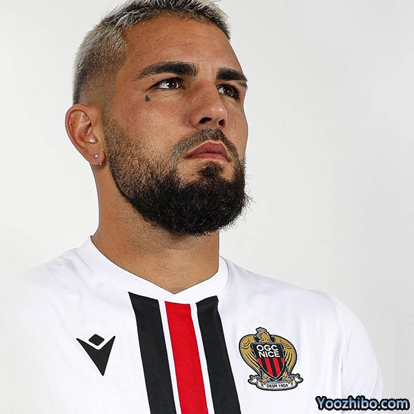 2022-23赛季尼斯客场球衣则以白色作为主色,正面中央带有两黑一红的竖条纹。球衣左侧带有红黑竖条纹的这一不对称设计让尼斯新赛季客场球衣更显与众不同。