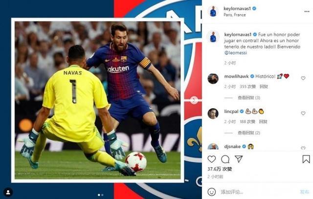 24直播网讯 北京时间8月13日,巴黎门将纳瓦斯i在Ins上发文欢迎梅西加盟球队。