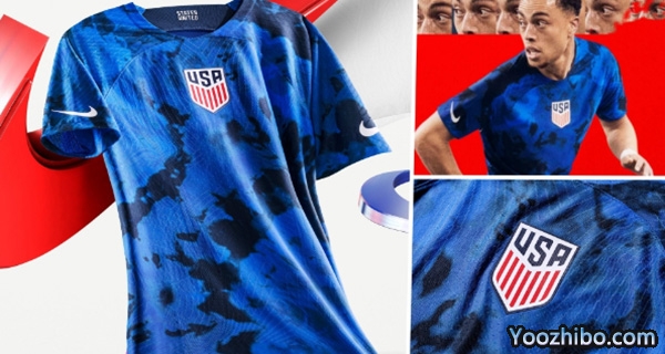 美国队的客场球衣设计与主场球衣类似,只是采用蓝色作为主色调。皇家蓝色为主,再加上浅蓝和深蓝进行扎染设计,充满了青春气息。在球衣的胸口正中央印有美国队的标志,布局独特,十分夺人眼球。