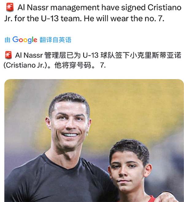 这是根据沙特媒体的报道显示,利雅得胜利俱乐部管理层正式签下了葡萄牙少年、传奇球星、利雅得胜利足球一线队队长C罗的儿子,以便他以官方身份加入俱乐部的青年组。利雅得胜利正式签下13岁迷你罗,他将身披7号并出任队长。