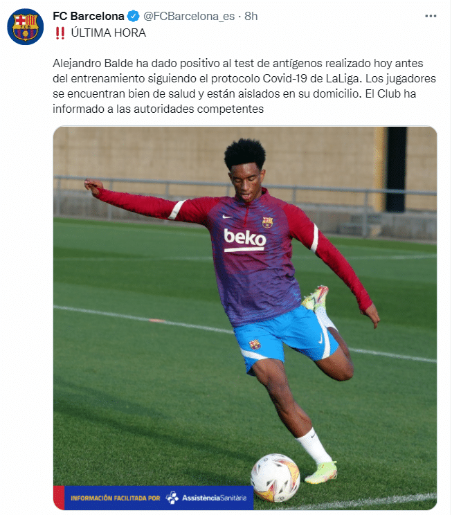 24直播网12月29日讯 据巴萨官方消息,球队18岁小将亚历杭德罗-巴尔德新冠检测呈阳性,已被隔离。