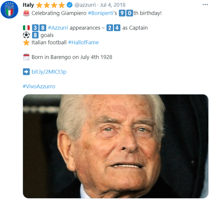 博尼佩尔蒂将在7月4日年吗93岁,他在16岁时就开始为尤文图斯效力,1947年他在尤文对阵AC米兰的比赛中完成意甲首秀。1950年至1961年间,他带领斑马军团赢得5座意甲冠军和2座意大利杯冠军。
