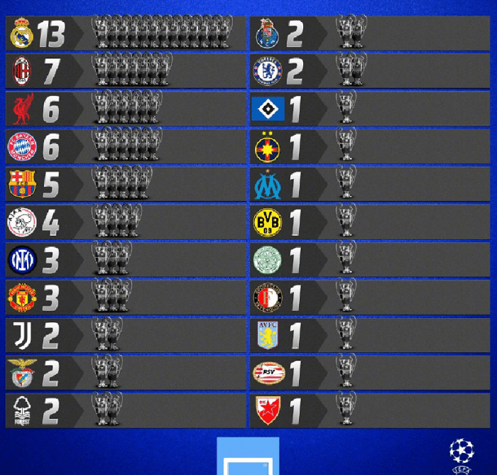 而球队方面,皇马13冠位居榜首,第二的米兰有7冠。随后是6冠的利物浦和拜仁,跟着是5冠的巴萨,随后是4冠的阿贾克斯,再往后是3冠的国米和曼联,夺得两冠的球队有尤文、本菲卡、诺丁汉森林、波尔图和切尔西。夺得1冠的球队有汉堡、布加勒斯特星、马赛、多特、费耶诺德、埃因霍温、维拉和贝尔格莱德红星。而进入决赛无冠的有3次进入决赛无冠的马竞,2次进入决赛无冠的兰斯和瓦伦西亚,剩下的进入1次决赛无冠的有巴黎、曼城、阿森纳、摩纳哥、佛罗伦萨、法兰克福、贝尔格莱德游击队、帕纳辛奈科斯、利兹联、门兴、圣埃蒂安、布鲁日、马尔默、罗马、桑普和勒沃库森。