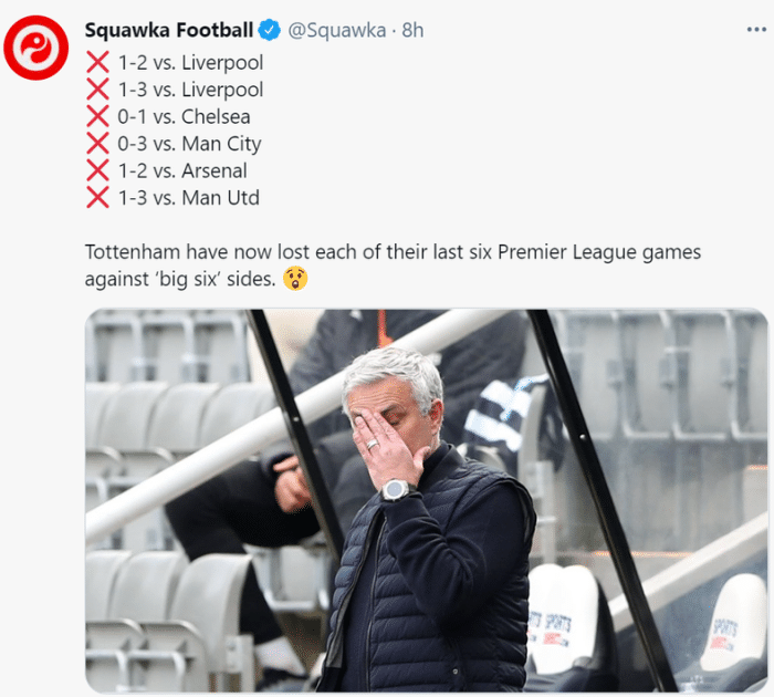 24直播网讯据Squawka统计,热刺近6次在英超联赛中遭遇Big 6球队遭遇全败。