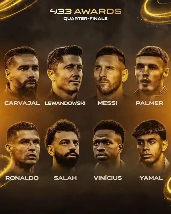 24直播网讯媒体433列出了2024年度最佳球员评选8强,梅西、C罗、莱万、维尼修斯、萨拉赫在列。