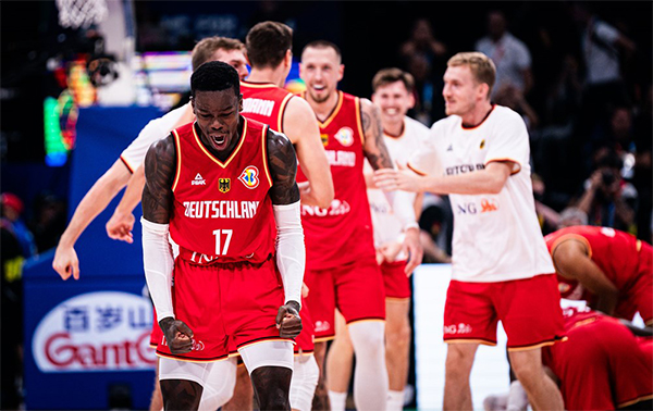 德国男篮队史首次在世界大赛上击败美国男篮,首次晋级世界杯决赛,赛后两队相互致意,施罗德紧紧拥抱里夫斯,两人热聊一番;之后安东尼站在场边搂着施罗德祝贺其晋级决赛。