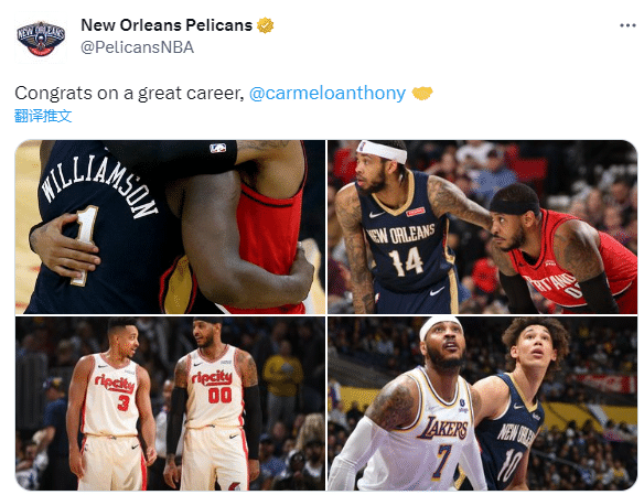 纽约尼克斯发推祝贺:“恭喜,你有一个很出色的职业生涯。”安东尼曾为尼克斯效力7个赛季,出战412场比赛,场均贡献24.7分7篮板3.2助攻。