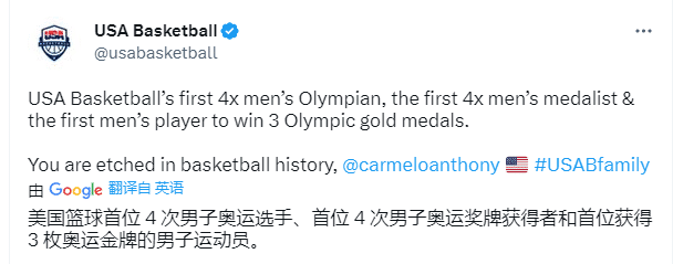 美国男篮官方感谢安东尼,美国男篮史上第一位4次参加奥运会以及4次夺得奥运奖牌和3次夺得奥运金牌的球员。