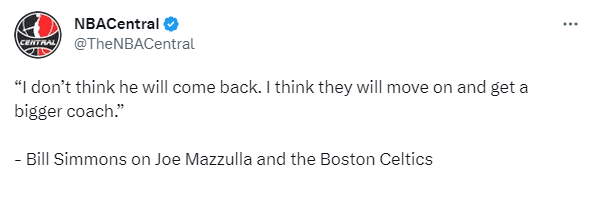 美国知名媒体人Bill Simmons谈到了目前绿军主帅马祖拉:我不认为马祖拉还会继续担任绿军主教练,他不会回来了。我认为他们(绿军)会继续前进,去寻找一个更有名气的教练。