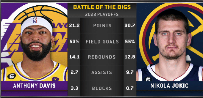 约基奇和浓眉的内线PK,是这轮系列赛的一大焦点对决。今年季后赛至今,浓眉场均21.2分14.1篮板2.7助攻3.3盖帽,投篮命中率53%,约基奇场均30.7分12.8篮板9.7助攻0.7盖帽,投篮命中率55%。