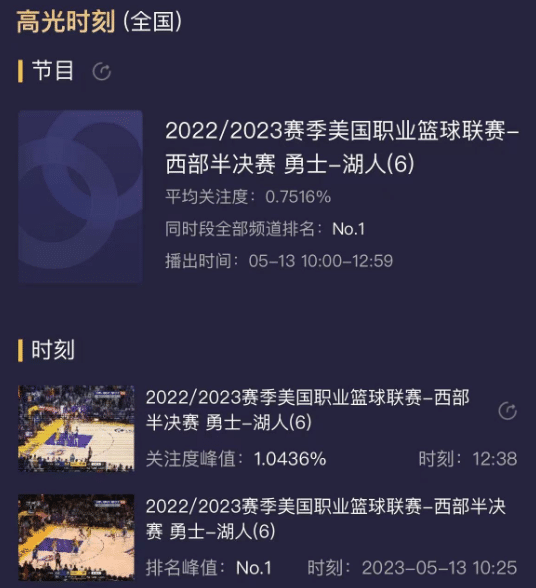 这场湖人击败勇士晋级的系列赛G6,收视率也非常高,虽然并非晚上的黄金时间段,但根据数据显示,平均收视率高达0.7516%,巅峰时间段收视率破1%,两项数据同时间段的全国第一。再加上比赛期间多个话题占据热搜榜的前列,甚至“湖人淘汰勇士”一度高居榜首,足以看出外界对于湖人VS勇士G6的关注度很高。