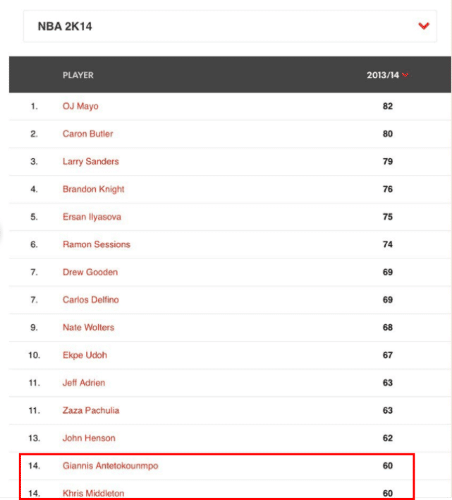 7年前的雄鹿队都有谁?从2K数值来看,那时候全队最高的是梅奥,数值达到82,他和卡隆-巴特勒(80)是全队仅有的两位数值达到80级别的球员。除了他们俩,雄鹿还有4位球员的数值达到70+,他们分别是桑德斯(79)、奈特(76)、伊利亚索瓦(75)和塞申斯(74)。字母哥和米德尔顿同为60,还不如帕楚里亚(63)与亨森(62)。