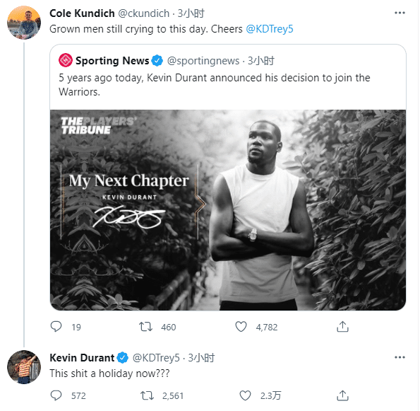不久前球迷评论杜兰特5年前加盟勇士的决定,发推抱怨:直到今天仍旧有人为此哭泣,庆祝吧杜兰特;对此杜兰特用大号强势回应:现在,这特么变成一个节日了吗???