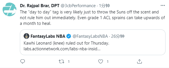 医学专家Rajpal Brar分析,快船把小卡放在每日观察名单上只是为了让太阳保持警惕,而不是宣布他系列赛报销;即使是十字韧带一级扭伤,至少也要一个月才能痊愈。