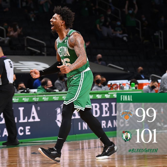 NBA常规赛,凯尔特人主场迎战尼克斯。两队分别刚刚负于东部的第一和第二,而且现在两支球队战绩相同分列东部的第七和第八位。显然尼克斯的表现超出了人们的预期,而凯尔特人本赛季并不让人满意。本场比赛沃克因背靠背轮休,富尼耶继续缺阵。一开场,两队均迟迟没有进入状态,进攻效率极低,杰伦单节拿到12分,凯尔特人领先2分结束首节。次节比赛,双方打得难解难分,TT连续补篮帮助凯尔特人最多时领先7分,巴雷特连得8分缩小分差,凯尔特人领先1分进入下半场。易边再战,两队互送进攻高潮,比分依然没有拉开,本节末段兰德尔连得7分,尼克斯领先3分结束第三节。末节比赛两队打得依然胶着,关键时刻斯玛特命中三分并且罚中两球,佩顿命中三分,塔图姆两罚全中杀死比赛。巴雷特投进三分无力回天,凯尔特人主场险胜。