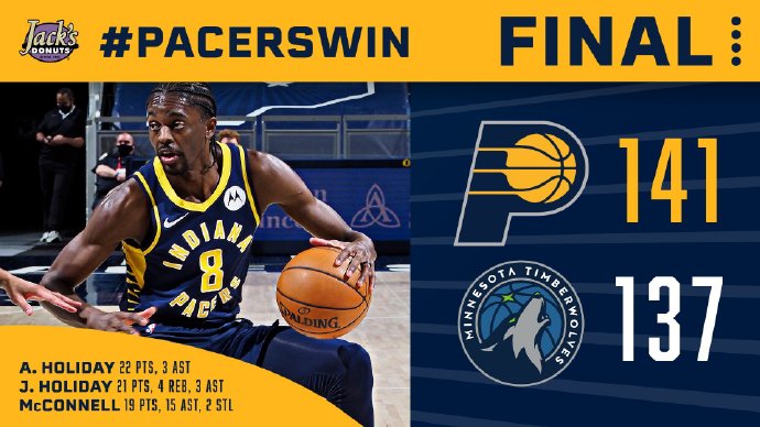步行者(22-26):勒韦尔17分5板3助1断、麦康纳19分15板2断、J-霍勒迪21分4板2助、A-霍勒迪20分1板3助、萨姆纳7分1板1助、麦克德莫特12分2助、桑普森16分5板