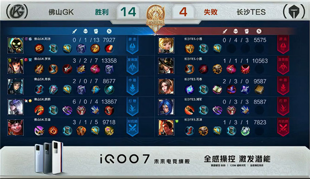 开局佛山GK入侵敌方野区反掉蓝BUFF。1分28秒长沙TES拿下中路河道之灵。2分20秒长沙TES拿下暴君。3分04秒佛山GK下路击杀沈梦溪拿到一血。4分37秒长沙TES野区击杀橘右京。8分11秒野区团战长沙TES打出0换2。8分37秒中路团战长沙TES打出0换3并摧毁敌方中路外塔。14分23秒长沙TES摧毁敌方中路二塔。16分18秒长沙TES上路击杀关羽。18分57秒长沙TES拿下暗影主宰。18分29秒野区团战佛山GK打出0换2。19分20秒佛山GK摧毁敌方中路外塔。21分02秒佛山GK抢下风暴龙王并在团战中打出0换2。21分43秒佛山GK摧毁敌方上路高地塔。21分53秒佛山GK打出1换3。22分08秒佛山GK摧毁敌方水晶拿下比赛。