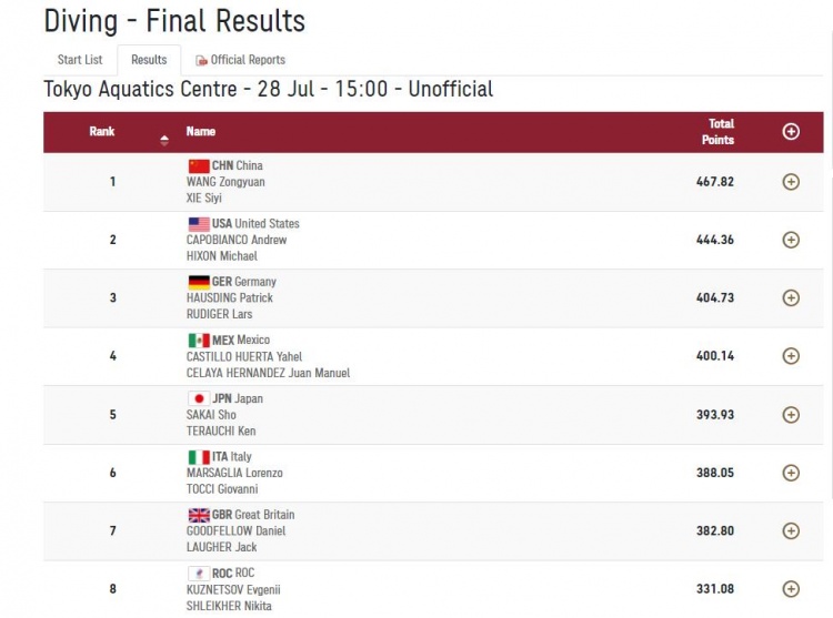 美国组合的109C完成得不错,拿到88.92分,总分是444.36分,他们拿到亚军。俄罗斯奥运队在做109C时失误,被判动作失败,拿到0分。德国队凭借最后一跳反超,以404.73分拿到铜牌。
