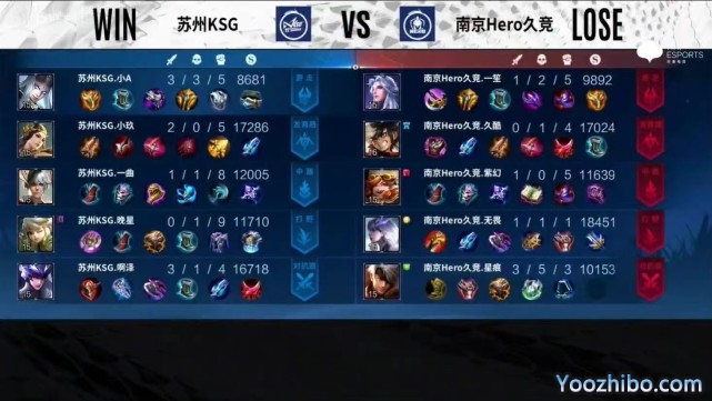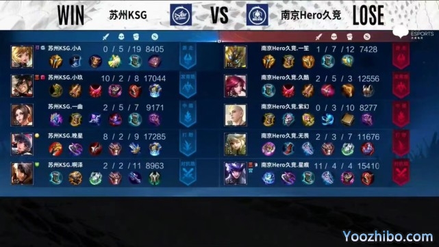 决胜局,苏州KSG蓝色方,拿到了宫本武藏+后羿+辅助拿到了明世隐的组合;南京Hero久竞红色方,选择了裴擒虎+虞姬。开局苏州KSG击杀张飞,拿下一血。6分钟,上路苏州KSG晚星宫本武藏单杀裴擒虎。8分钟,苏州KSG直推中路一塔。决胜团,苏州KSG先手抓掉带线的裴擒虎,苏州KSG强推下路高地,晚星宫本武藏天下无双,切掉对面双C,一波直推水晶,拿下一最终胜利!
