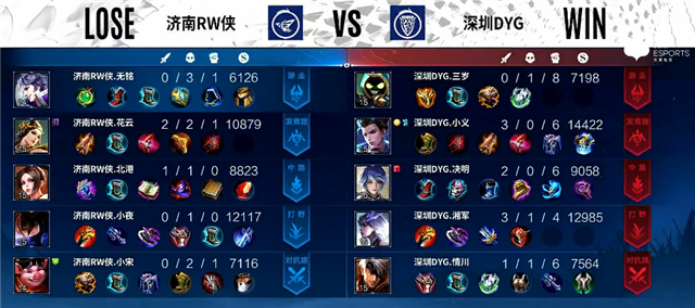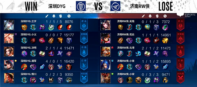 2分10秒下路团战,虞姬拿下一血。3分40秒澜拿下暴君,镜拿下主宰。4分40秒刘邦被击杀。5分45秒狄仁杰推掉下路一塔。7分20秒河道团战,虞姬被击杀。8分40秒澜拿下暴君。9分钟狄仁杰推掉中路一塔。10分20秒澜拿下主宰。10分40秒镜拿下暴君。12分50秒中路团战,深圳DYG打出0换2。13分34秒狄仁杰推掉中路高地塔。14分钟镜拿下暴君。15分30秒中路团战,深圳DYG团灭济南RW侠。15分57秒深圳DYG推掉水晶率先拿下赛点。