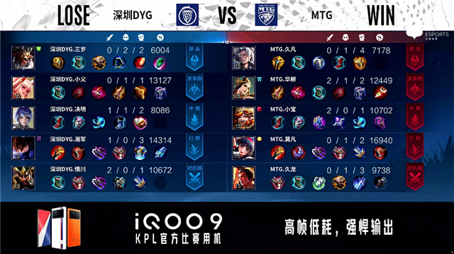 54秒,深圳DYG吕布上路越塔击杀马可波罗拿下一血。2分24秒,MTG控下暴君。3分25秒,MTG王昭君中路击杀盾山。5分43秒,MTG破掉深圳DYG下一塔。6分44秒,MTG控下暴君。8分30秒,双方团,深圳DYG打出1换3。8分55秒,深圳DYG破掉MTG中一塔。11分08秒,深圳DYG控下暗影主宰。12分23秒,深圳DYG击杀夏侯惇。13分01秒,深圳DYG控下暗影暴君。14分13秒,深圳DYG破掉MTG上二塔。15分25秒,MTG橘右京击杀吕布。16分02秒,MTG控下暗影主宰,随后双方团战1换1。18分23秒,深圳DYG控下暗影暴君。19分11秒,双方团,MTG打出0换2,马可波罗拿下双杀。20分20秒,深圳DYG击杀王昭君,随后控下风暴龙王。21分09秒,深圳DYG破掉MTG中高地,随后MTG橘右京带掉深圳DYG下高地。24分55秒,双方团战1换1。215分52秒,MTG橘右京偷掉深圳DYG上高地,随后王昭君抢到风暴龙王。26分10秒,双方团,MTG打出1换5团灭对手。26分46秒,MTG摧毁深圳DYG水晶扳平比分,双方进入决胜局。