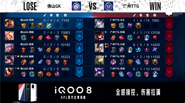 1分48秒,广州TTG兰陵王击杀橘右京拿下一血。2分57秒,广州TTG上、下路同时开花,击杀敌方两人。3分30秒,广州TTG控下先知主宰。4分38秒,佛山GK破掉广州TTG上一塔。4分58秒,广州TTG下路打出0换2,随后破掉佛山GK下一塔。5分26秒,广州TTG控下暴君。6分36秒,广州TTG兰陵王击杀橘右京。6分51秒,下路团双方1换1。8分30秒,佛山GK破掉广州TTG下一塔,广州TTG破掉佛山GK上一塔。9分40秒,广州TTG干将莫邪六剑瞬秒王昭君。9分58秒,广州TTG中路打出0换2,随后破掉佛山GK上二塔。10分32秒,广州TTG破掉佛山GK中一塔。10分38秒,广州TTG控下暗影主宰。11分16秒,广州TTG破掉佛山GK下二塔。14分05秒,广州TTG打出0换2。15分05秒,广州TTG控下暗影主宰。15分44秒,广州TTG破掉佛山GK上高地。16分53秒,双方团战1换1,广州TTG破掉佛山GK下高地。18分20秒,广州TTG拿下暗影暴君。19分02秒,广州TTG破掉佛山GK中高地。20分09秒,双方团,广州TTG打出0换5团灭对手,随后一波摧毁佛山GK水晶赢下比赛。