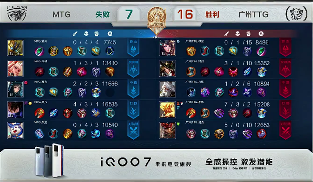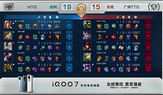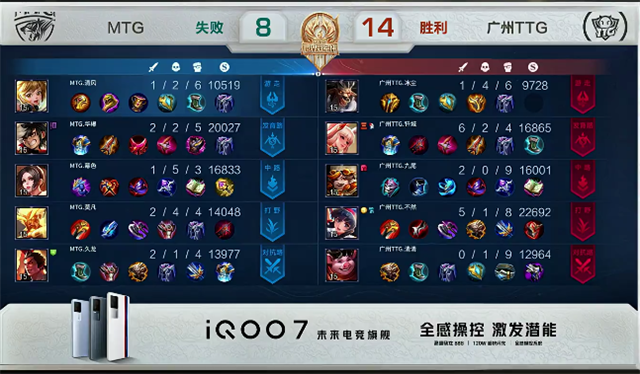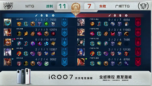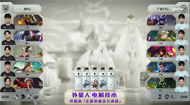 双方和平开局。2分10秒下路交火,兰陵王拿到一血,团战广州TTG打出1换2。3分钟上路团战,双方1换1。3分30秒兰陵王拿下主宰。4分13秒虞姬推掉下路一塔。5分30秒兰陵王拿下暴君,团战中马超被击杀。6分10秒虞姬被击杀。8分50秒嬴政推掉中路一塔。9分18秒阿古朵拿下主宰。9分32秒野区团战,MTG打出1换2。10分钟马超被击杀。10分10秒兰陵王拿下暴君。11分47秒双方1换1。12分钟马超推掉下路一塔。13分钟兰陵王拿下主宰。14分25秒野区团战,双方3换3。16分07秒阿古朵拿下暴君,团战广州TTG打出1换4。16分50秒广州TTG推掉下路高地塔,马超被击杀。17分49秒MTG推掉中路高地塔。18分32秒关羽抢下主宰。20分47秒中路团战,双方1换1。21分42秒MTG推掉水晶率先拿到赛点。