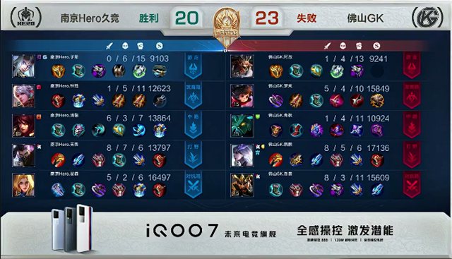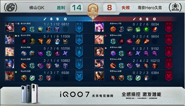开局佛山GK入侵野区拿下红Buff,狄仁杰击杀公孙离拿下一血。2分10秒娜可露露拿下暴君。2分26秒廉颇推掉上路一塔。3分钟橘右京拿下主宰。3分50秒廉颇被击杀。4分10秒狄仁杰推掉下路一塔。5分18秒狄仁杰推掉下路二塔。6分20秒橘右京拿下暴君。6分30秒佛山GK入侵蓝区,嫦娥被击杀。7分30秒娜可露露拿下暴君,中路团战中佛山GK打出2换4。8分45秒狄仁杰推掉中路一塔。9分30秒南京Hero久竞上路二塔被破,佛山GK下路一塔被破。10分15秒下路团战,廉颇被击杀。11分20秒橘右京拿下暴君。14分钟佛山GK推掉下路高地塔。14分20秒野区团战,佛山GK打出2换4。佛山GK顺势一波直上高地,14分51秒佛山GK推掉水晶率先拿到赛点。