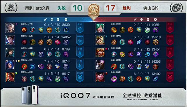 双方和平开局。1分50秒上路团战,马超拿下一血。3分10秒上官婉儿被击杀。3分40秒张良被击杀。4分50秒上路团战,佛山GK打出1换2。5分10秒南京Hero久竞上路一塔被破。6分20秒佛山GK下路一塔被破。6分30秒澜拿下暴君,团战佛山GK打出1换2。6分50秒公孙离推掉中路一塔。7分50秒公孙离拿下主宰。8分45秒野区团战团战,双方1换1。10分24秒阿古朵拿下主宰。10分30秒澜拿下暴君,团战南京Hero久竞打出1换3。11分钟南京Hero久竞推掉中路一塔和二塔。12分钟野区团战,佛山GK打出0换2,佛山GK顺势一波推掉中路高地塔。15分37秒马超拿下暴君。16分35秒野区团战,南京Hero久竞打出0换2。19分10秒上河道团战,南京Hero久竞打出2换5团灭佛山GK。20分01秒南京Hero久竞推掉水晶拿下本场比赛胜利。