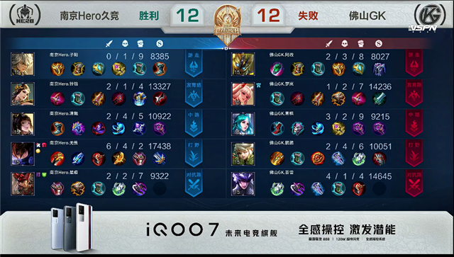开局南京Hero久竞入侵野区,李元芳拿下一血。1分10秒佛山GK强攻下路一塔击杀百里守约。2分钟李元芳推掉下路一塔。2分20秒镜拿下暴君。3分40秒镜推掉上路一塔。4分05秒镜拿下主宰。5分钟牛魔被击杀。6分25秒镜拿下暴君。6分30秒野区团战,佛山GK打出1换3。7分40秒镜拿下主宰。8分20秒野区团战,双方1换1。10分10秒兰陵王和李元芳1换1。11分50秒野区团战,佛山GK打出0换4。佛山GK顺势中路一波直逼水晶,兰陵王一人守家拖到队友复活,一波反打打出0换4。12分30秒南京Hero久竞拿下暴君。13分45秒南京Hero久竞推掉中路一塔。14分20秒野区团战,南京Hero久竞打出2换3,夏洛特推掉上路高地塔。15分10秒周瑜被击杀。18分10秒镜拿下暴君,团战南京Hero久竞打出2换3。20分40秒野区团战,双方打出2换2。22分40秒上河道团战,南京Hero久竞打出0换4,周瑜拿下四杀,南京Hero久竞顺势中路一波直上高地。23分18秒南京Hero久竞团灭佛山GK推掉水晶追平比分。