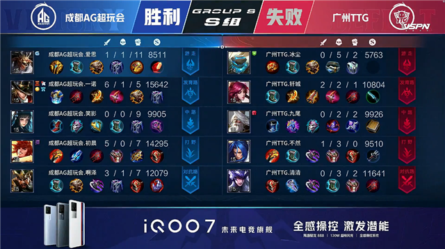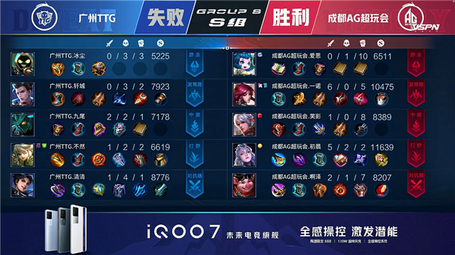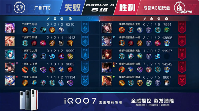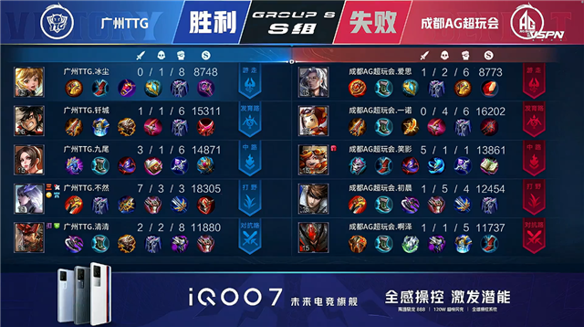 双方常规开局。1分54秒广州TTG上路击杀白起拿到一血。2分30秒广州TTG拿下主宰。4分06秒成都AG下路打出0换2。4分47秒成都AG拿下暴君。6分48秒广州TTG下路击杀鲁班七号。7分01秒成都AG中路下河道击杀廉颇。7分19秒广州TTG抢下主宰。9分01秒成都AG野区击杀廉颇。9分09秒成都AG拿下暴君。9分27秒中路团战广州TTG打出0换2。10分26秒广州TTG拿下暗影暴君。广州TTG拿下暗影主宰。13分02秒广州TTG团战打出1换3,镜拿到三连决胜。13分22秒广州TTG上路击杀赵云。13分40秒广州TTG摧毁敌方上路高地塔。14分39秒广州TTG拿下暗影暴君。15分01秒广州TTG摧毁敌方中路二塔。15分17秒广州TTG高地团战击杀赵云。15分39秒高地团战成都AG击杀不知火舞,广州TTG摧毁敌方中路高地塔。17分07秒广州TTG拿下暗影主宰。18分53秒广州TTG拿下暗影暴君。20分36秒中路团战双方打野互换。21分17秒广州TTG上路打出0换2。22分06秒广州TTG摧毁敌方水晶拿下比赛。
