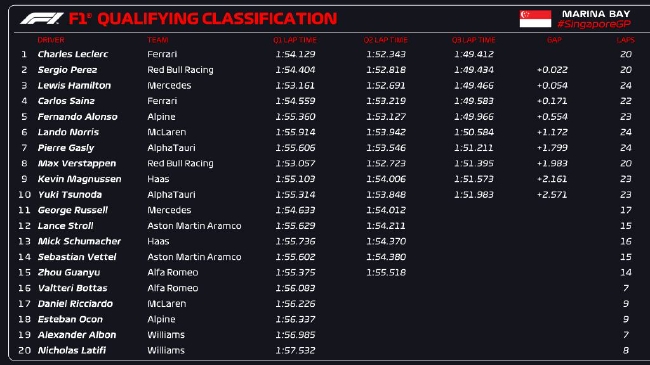 24直播网讯 2022年F1新加坡大奖赛排位赛在滨海湾赛道结束。Q3竞争非常激烈,最快圈速多次被刷新!最终,法拉利车队勒克莱尔继2019年后,再次拿到新加坡大奖赛的杆位!红牛车队佩雷兹第二,梅赛德斯车队汉密尔顿第三!维斯塔潘第八,中国车手周冠宇第15。