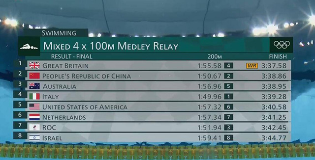 24直播网7月31日讯 奥运会男女混合4X100米混合泳接力决赛,中国队获得银牌!英国队夺金打破了此前中国队创造的纪录(3分38秒41),铜牌由澳大利亚获得。