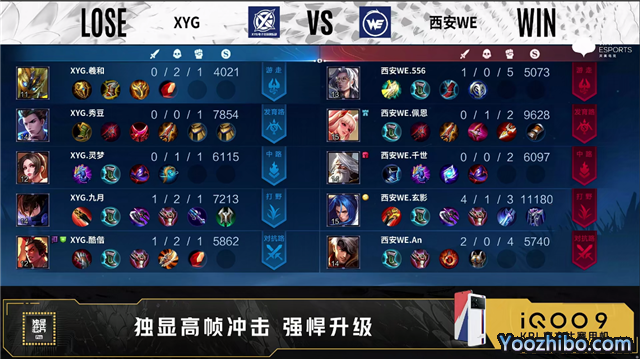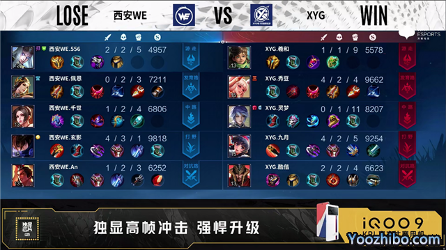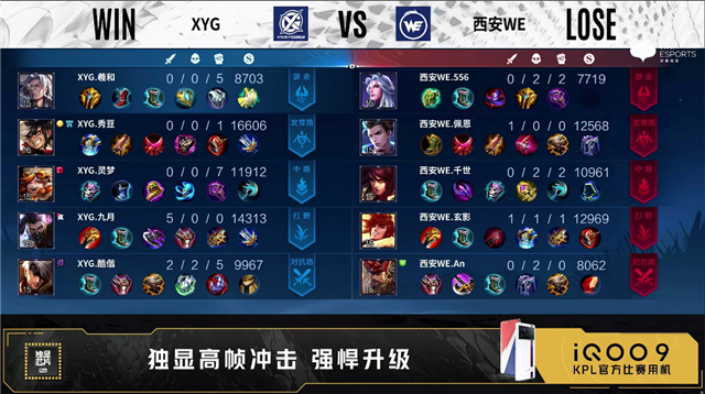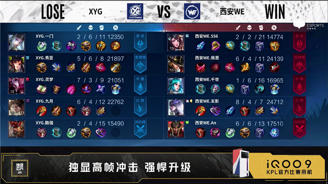第一局开局西安WE发育路、对抗路换线。3分48秒西安WE拿下先知主宰。4分05秒XYG拿下暴君。4分50秒西安WE野区击杀东皇太一拿下一血。5分43秒双方互换边路外塔。6分钟野区团双方打出1换1。6分47秒XYG摧毁敌方中路外塔。7分18秒双方再次镜像换掉边路外塔。8分01秒XYG拿下主宰。9分钟对抗路团XYG打出2换4。10分34秒西安WE拿下暗影暴君。10分56秒XYG拿下暗影主宰。11分02秒西安WE摧毁敌方发育路二塔。11分28秒西安WE野区击杀廉颇。12分25秒中路团XYG击杀王昭君。13分08秒XYG摧毁敌方发育路二塔。14分53秒XYG中路击杀镜。15分05秒XYG拿下暗影主宰。15分20秒对抗路团XYG打出0换2,随后摧毁敌方对抗路二塔。16分07秒XYG摧毁敌方中路高地塔。16分35秒XYG摧毁敌方对抗路高地塔,高地团双方4换4。17分40秒西安WE拿下暗影暴君。18分25秒野区团西安WE打出0换2,随后摧毁敌方中路外塔。19分03秒西安WE拿下暗影主宰。20分钟发育路团XYG打出2换3,西安WE摧毁敌方发育路高地塔。22分24秒XYG拿下风暴龙王。22分35秒西安WE发育路击杀廉颇。24分10秒龙坑处团战XYG打出1换2。25分38秒XYG拿下风暴龙王。28分35秒中路团西安WE打出1换3。29分39秒西安WE拿下风暴龙王。30分15秒西安WE先后摧毁敌方对抗路二塔、高地塔。30分47秒XYG高地处击杀蒙恬。33分30秒风暴龙王处团战西安WE打出1换5团灭对手。34分15秒西安WE摧毁敌方水晶拿下比赛。