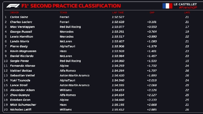 24直播网讯 北京时间07月23日,2022年F1法国大奖赛第2次练习赛在保罗-里卡德赛道结束。法拉利车手包揽了圈速前两位,塞恩斯最终以1:32.527排名第一,勒克莱尔落后0.101秒排名第二,红牛车队维斯塔潘落后0.550秒排名第三,拉塞尔和汉密尔顿分列四五。排名六至十位的车手分别是诺里斯、加斯利、马格努森、里卡多、佩雷兹。中国车手周冠宇名列第17位。