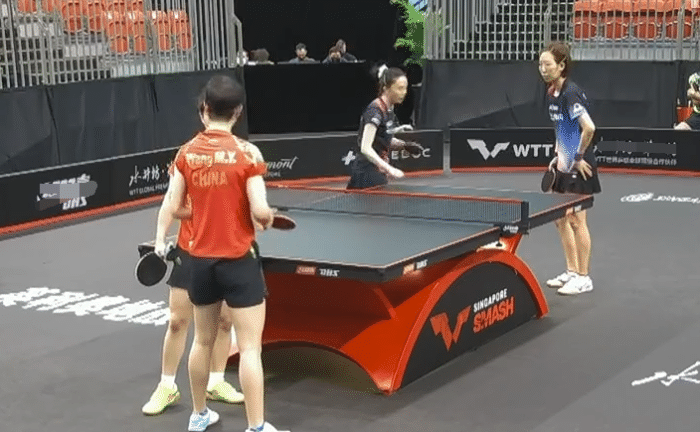 接下来进行的一场比赛是女双的比赛王曼昱 /孙颖莎对阵韩国组合田志希/梁夏银,本届赛事孙颖莎的任务也是比较的重,她分别参加了女单的比赛,混双的比赛,女双的比赛,此面的赛事孙颖莎发挥十分不错,加上对手的实力相对不是很强,她皆是取得了胜利,她与王曼昱搭档的女双组合也是夺冠大热门,女双组合两人排名世界第一。