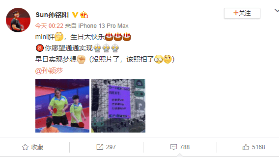 孙颖莎的搭档孙铭阳也送上祝福:mini胖,生日大快乐,祝你愿望通通实现,早日实现梦想,没照片了,该照相了。