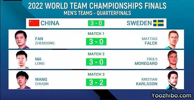 第三场,王楚钦对阵卡尔森,后者超水平发挥,第一局,士气上压倒王楚钦,后者显得信心不足,卡尔森把握住机会11-9取得,拿下第一局;第二局,王楚钦依旧状态一般,卡尔森不断强攻,王楚钦回球失误或出界,再下一城,2-0领先;第三局,王楚钦找回状态,而卡尔森体能下降,回球力度和角度不理想,王楚钦连续下分,11-3取胜,1-2追回。第四局,王楚钦8-4领先,被卡尔森连扳3球,7-8,王楚钦叫暂停,回来后11-7,将大比分扳为2-2。第五局,王楚钦状态神勇,4-2领先,随后靠发球拿分,5-3,最终11-6拿下决胜局,实现了大逆转。中国队总比分3-0淘汰瑞典队,晋级世乒赛4强。