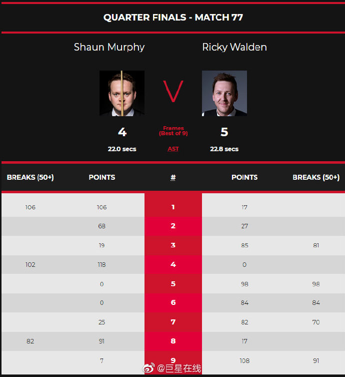 两人之前交手,肖恩墨菲14胜5负处于绝对领先优势。开局肖恩墨菲凭借单杆106分以2比0开场,随后里奇沃顿扳回一局,第四局肖恩墨菲再次破百3比1领先。