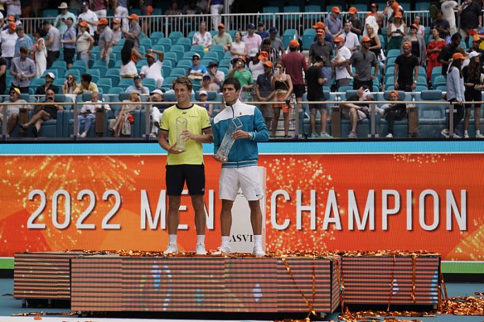 24直播网04月06日讯 上周日,18岁的阿尔卡拉斯成为迈阿密公开赛历史上最年轻的冠军,也是史上第三年轻的大师赛冠军得主。这一胜利对这位西班牙人来说是一个星光闪耀的赛季开始,他之前也成为了里约热内卢ATP 500赛事历史上最年轻的冠军。目前,他已经在对阵前10名选手中取得了7场胜利。这位世界排名第11的选手被誉为未来的世界第一,有一天他很可能会取代他的偶像纳达尔成为西班牙网球的领袖。尽管纳达尔目前没有打算在短期内退役,但一位前大满贯决赛选手相信,他的年轻同胞会刺激纳达尔在巡回赛上更加努力。