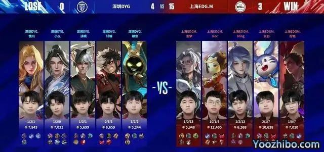 第二局,深圳DYG蓝色方,拿到了镜+鲁班七号。上海EDGM红色方,拿到了宫本武藏+公孙离。开局双方和平发育。8分钟,深圳DYG击杀干将莫邪,拿下一血。决胜团,上海EDGM公孙离输出拉满,拿下三杀。一波团灭深圳DYG,直推水晶,拿下赛点。