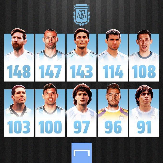 凭借此次首发,梅西的国家队出场次数已经上涨到了148次,超越马斯切拉诺,成为潘帕斯雄鹰历史上出场最多的球员。