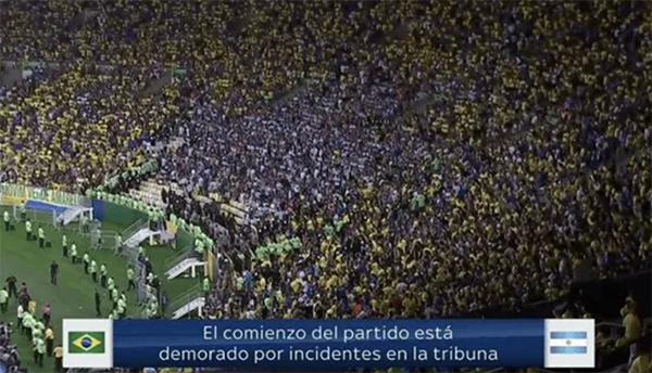 据悉在马拉卡纳的这次冲突接近3分钟,几乎贯穿了整个阿根廷国歌播放的过程,马拉卡纳的许多人流着血,许多害怕的孩子在哭泣。