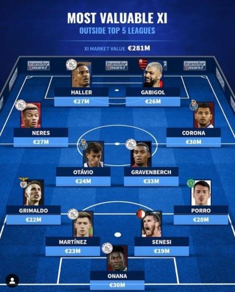 中场:内雷斯(阿贾克斯,2700万)、奥塔维奥(波尔图,2400万)、格拉文贝奇(阿贾克斯,3300万)、科罗纳(波尔图,3000万)