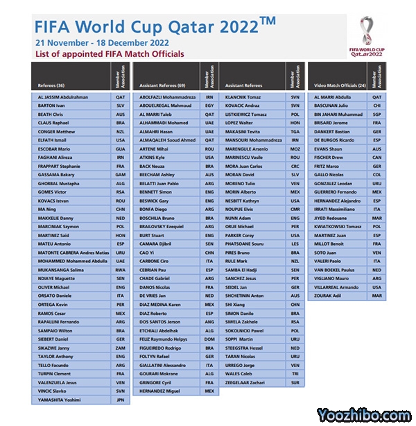裁判名单包括36名主裁、69名助理裁判和24名视频助理裁判。国际足联表示,名单根据裁判的水平和近年来在国际比赛以及国内比赛中的表现选出。