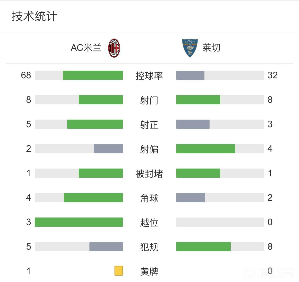 最终AC米兰2-0击败莱切,联赛四轮不败。