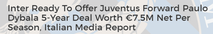 24直播网01月18日讯 消息,《米兰体育报》称国米已经告知迪巴拉,愿意为他开出年薪750万欧的5年合同。