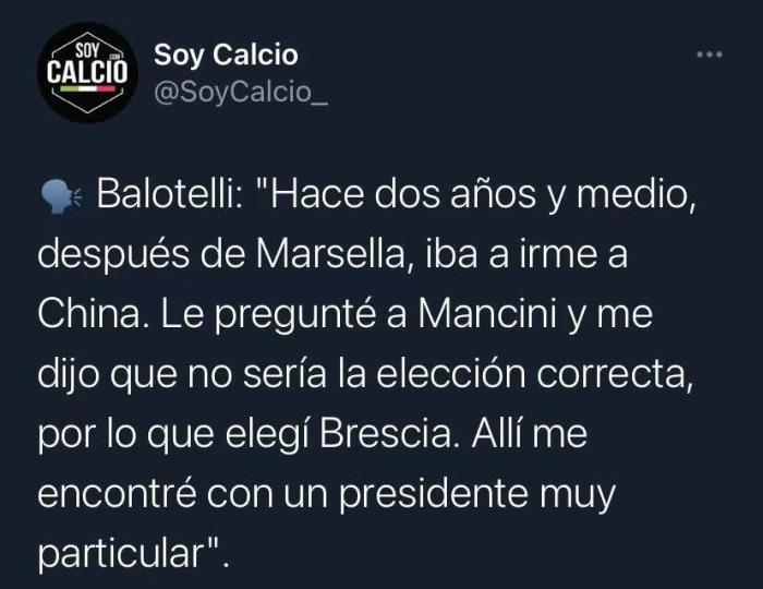 巴洛特利说:“大概两年半前,我离开马赛,准备去中国踢球。我问了曼奇尼,他告诉我这不是一个正确的选择,所以我选择了布雷西亚。”